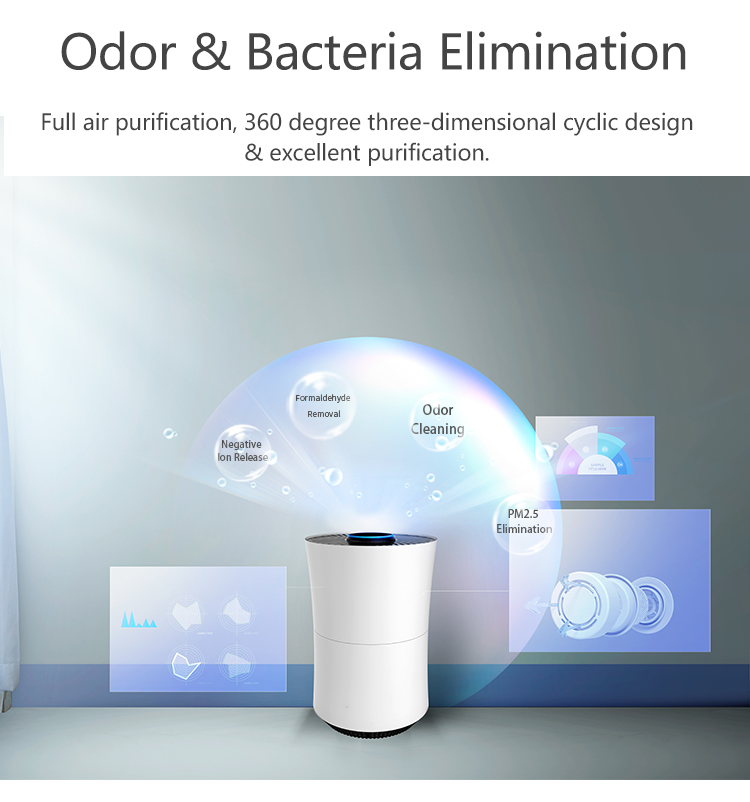 Het unieke ontwerp zorgt ervoor dat de binnenlucht snel 360° circuleert, stof, PM2.5, formaldehyde en andere stoffen absorbeert en de lucht effectief zuivert. Tegelijkertijd, om gebruikers niet te hinderen, is het geluidsniveau in de slaapstand slechts 48 dB, zodat gebruikers rustig kunnen slapen.