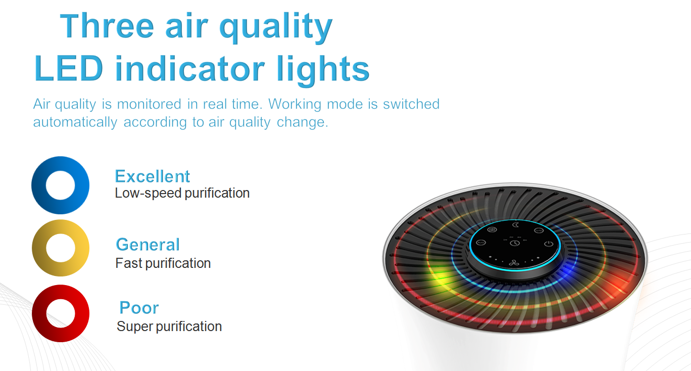 L'indicatore di qualità dell'aria del purificatore ti permetterà di conoscere a colpo d'occhio la purezza dell'aria. I diversi colori rappresentano diversi livelli di inquinamento atmosferico. In modalità automatica, il purificatore d'aria regolerà automaticamente la velocità della ventola in base alla qualità dell'aria. Quando l'indicatore di sostituzione del filtro si accende, saprai che è ora di sostituire il filtro e goderti un'aria più fresca.