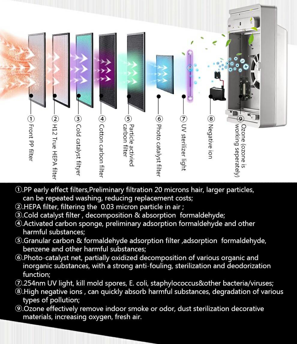 When purchasing an air purifier, one of the most important considerations is the real high efficiency particulate air (HEPA) filtration capability. Guanglei’s air purifier can achieve this. Even the smallest pollutants, including pollen, pollutants and other particles, can achieve an effective capture rate of 99.97%. It also has enough energy to absorb more than 99% of volatile organic compounds, such as acetaldehyde and ammonia.